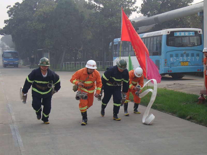 參加演練活動(dòng)的有各部門、分廠及公司外協(xié)施工單位等200余人。演練前,公司消防員組織演練人員參觀“11.9”消防安全宣傳板報(bào),向他們講解滅火器的使用方法和適用范圍、防化服的穿著和空氣呼吸器的使用方法及火災(zāi)發(fā)生后如何逃生等。接著,公司消防隊(duì)員演示了明火撲救、兩盤水帶的連接和出水以及五盤水帶連接和出水。最后,各部門、分廠及施工單位進(jìn)行了明火撲救,應(yīng)急逃生等演練。