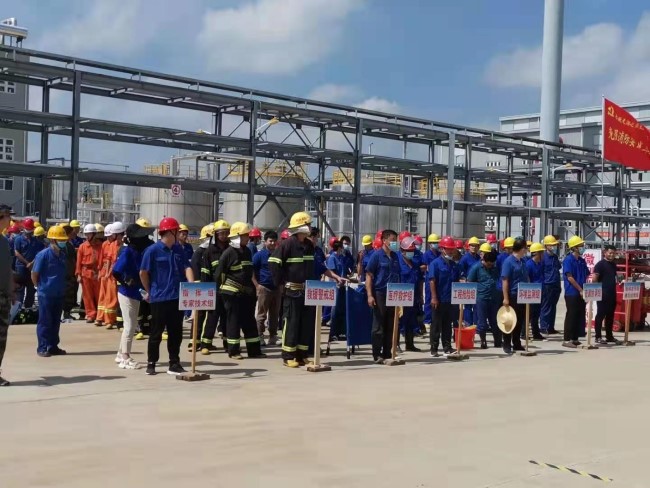 為檢驗《天潤化工生產(chǎn)安全事故綜合應(yīng)急預(yù)案》在新廠區(qū)的可行性,7月22日上午,天潤公司在新廠區(qū)重大危險源1#丙烯腈罐區(qū)進行了綜合應(yīng)急演練。公司黨委書記、總經(jīng)理劉彭城任現(xiàn)場演練總指揮,黨委經(jīng)營班子成員、中層管理人員、安全管理人員及相關(guān)部門應(yīng)急救援組成員等70余人參與演練。