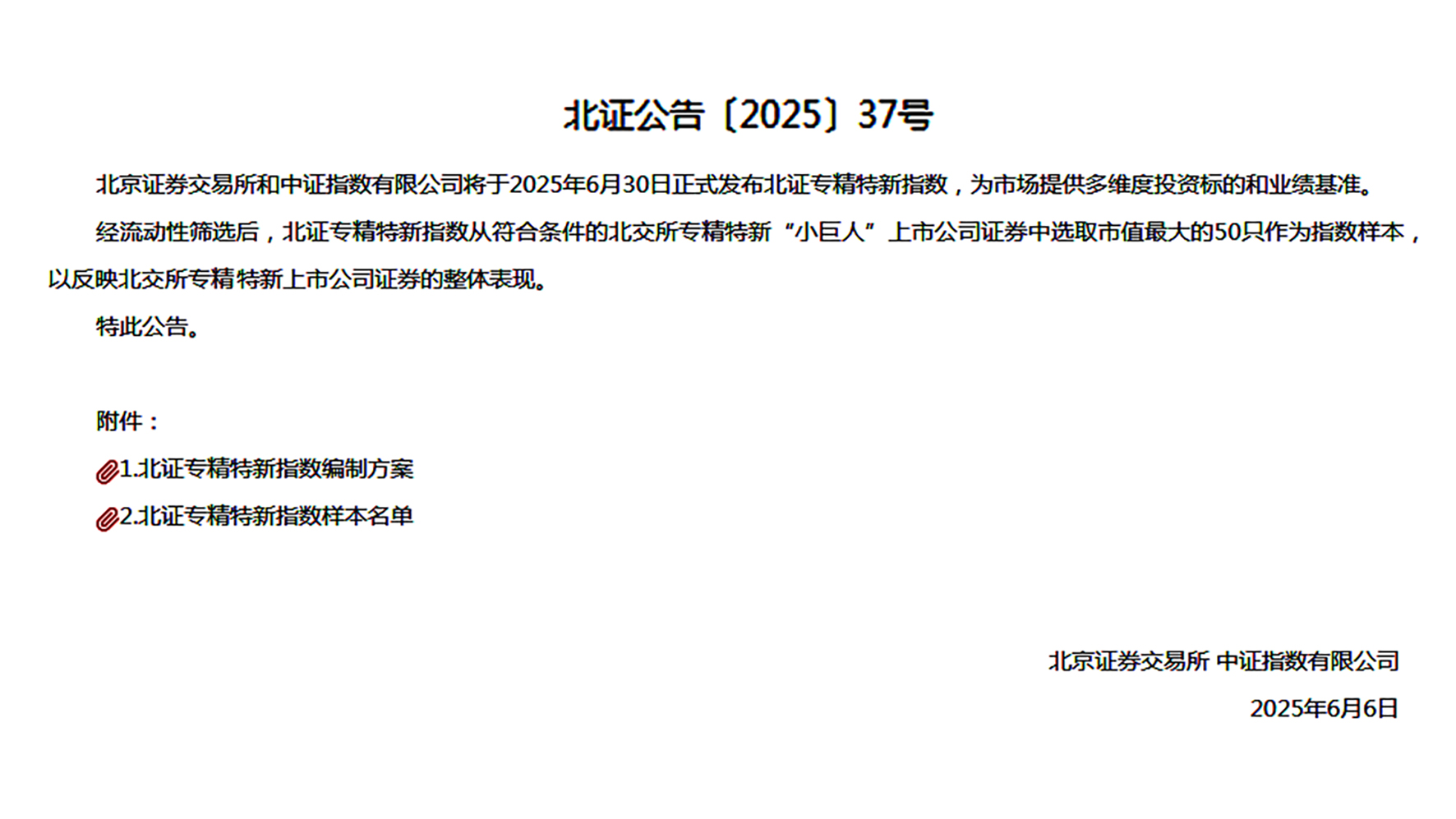 6月6日晚,北交所和中證指數(shù)公司共同公告,將于2025年6月30日正式發(fā)布北證專精特新指數(shù),蚌投集團所屬北交所上...